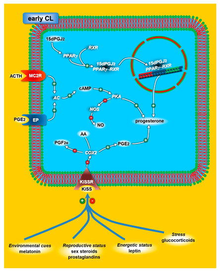 KiSS and its receptor KiSS1R are expressed in various ovarian structures, including the CL of several mammalian species [137,138,139], supporting the hypothesis that these neuropeptides can regulate the CL lifespan by modulating the steroidogenic enzymes controlling progesterone synthesis. Moreover, Laoharatchatathanin et al. [140] suggested that KiSS is involved in the luteinization of rat granulosa cells.