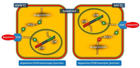 Our studies [133] provide evidence that CL produce DA and that the DA/D1R-D3R system regulates the CL lifespan by exerting either luteotrophic or luteolytic actions depending on the luteal stage. In fact, the DA/D1R-D3R system stimulated PGE2 and progesterone synthesis by early CL, while it increased PGF2α production and decreased progesterone production by mid- and late-CL (Figure 5).