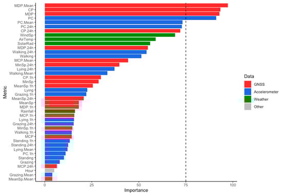 Feature importance for the integrated dataset determined by receiver operating characteristics (ROC) curve analysis. Data types are: GNSS-derived (red); accelerometer-derived (blue); weather (green) and other (grey). Only those metrics with an importance “score” above the chosen threshold (dashed line) were used in the ML. Refer to Table 1 for metric definitions.