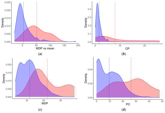 Density plots of the four most important features (determined by ROC curve analysis) for differentiation between lambing (red) and non-lambing (blue) animals using the training dataset (from Trial One). Features are: (a) MDP.Mean—Mean of mean distance to peers (for all peers); (b) CP—closest peer (for individual animal); (c) MDP—mean distance to peers (for individual animal); (d) PC—posture change (for individual animal). Mean lines are also shown (lambing: red dashed line; non-lambing: blue dashed line). The key characteristics of all features are the higher mean values and wider distributions when sheep are lambing.