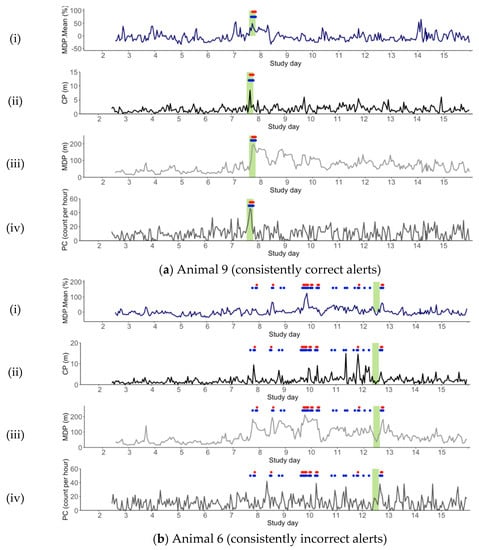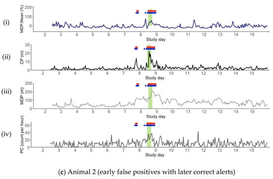 Animal 2 is an example of a ewe that displays early false positives followed by correct lambing alert. As shown in Figure 3c, false positives were evident on the day prior to birth (Study Day 7) due to a peak in both CP and MDP. This may reflect variable social activity of this ewe or it may demonstrate early social isolation and/or a time of birth site selection or nesting behaviour [,]. If this could be isolated, this behaviour could be used as powerful predictor of impending parturition, providing producers with the opportunity to act on an alert prior to the event occurring. However, as isolation at parturition is inconsistent in domestic sheep [], the ability to generalise this behaviour across numerous individuals is unlikely.