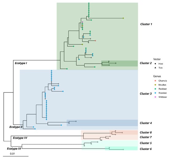 Maximum likelihood phylogenetic tree based on groEL gene of Italian strains collected from wild ungulates (dots) and their Ixodes ricinus ticks (triangles). Species of origin are color-coded. Ecotypes and respective clusters are highlighted with different colors. For graphical reasons, only a subset of reference sequences [] is included.