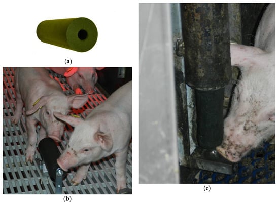 Three different objects were used during the trial. The first material was an algae material (Algopack, Saint-Malo, France) made of Saccharina latissimi, which is a brown macroalgae or seaweed, post-harvest dried and compressed under heat into a cylinder (15 × 5 cm, 380 g) with an axial hole (Table S1 and Figure 1a). From D15 to D28, during the suckling period, the cylinder was placed horizontally on a roll dispenser mounted on the floor (height of dispenser: 12 cm above the floor) located 50 cm from the sow’s head (Figure 1b). The cylinder can spin around its axis on the roll dispenser. One cylinder was placed in each pen. After weaning, in the post-weaning and fattening rooms and until D104, the cylinders were threaded into the axis of metal vertical roll dispensers (65 × 7 cm). Only the bottom of the cylinder was accessible to the pigs (Figure 1c). The dispenser was mounted on the pen wall at a height of 12 cm in the post-weaning pens and at 30 cm in the finishing pens. There was one dispenser in each pen. The second material was wood beams (square section 5 × 5 cm, 40 cm, 300 g), which were supplied in the same device as the algae cylinders. The third material was metal chains made of 2.5 × 4 cm links (link section: 0.5 cm) suspended along the pen wall; the end of the chain was a few centimeters above the floor. Wood and metal chains were given from D28 to D104.