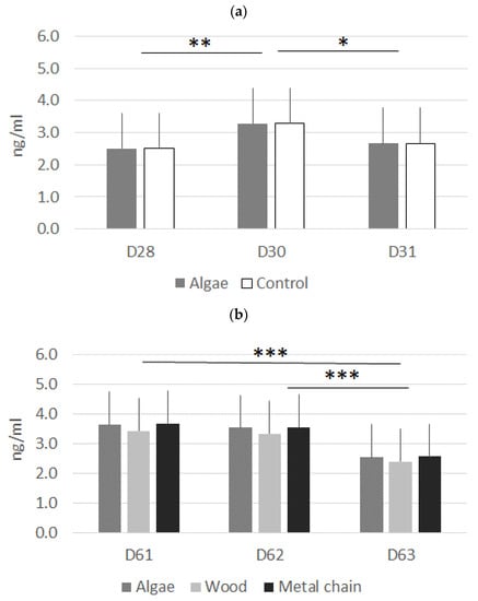 Our results on salivary cortisol are in the same range as previous results [13,31,32,33]. There was no difference between treatments, although the cortisol level increased after transfer from the farrowing pen to the nursery pen. We hypothesized that algae cylinders, as a better source of stimulation than other material, would prepare the animals to cope with new stressing challenges (separation from the sow and changes in diet and environment) and to adapt faster to new situations, as suggested in other experiments [12,13,34]. The results tend to demonstrate that, in farrowing pens, the algae objects were not sufficient for piglets to enhance their ability to cope with a new situation. No difference was found after transfer from the nursery pen to the growing pens (D61 to D62). This transfer is obviously less stressing for animals than the previous one. However, due to a technical error, the pigs were fasted before transfer, which was not part of the experimental protocol. Therefore, the stress due to starvation arrived before the stress of transfer. However, no differences have been observed between the three materials (A, W or MC), even if we cannot conclude on this point, as we do not have the cortisol level before stress.
