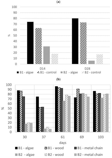 Frequency of pigs with a lesion score of 1–2 (1: moderately and 2: heavily injured) according to enrichment material from (a) Day 15 to Day 28; and (b) Day 30 to Day 103 (n = 128 in batch B1 and n = 114 in batch B2).