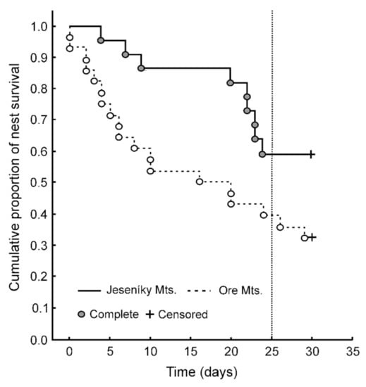 Cumulative proportion of nest survival in Jeseníky and Ore Mts. during the study period. The dashed vertical line at 25 days (incubation time) shows different survival rate for Jeseníky Mts. (0.59) and Ore Mts. (0.32). Kaplan–Meier method was used to fit the curves. Complete (predated) and censored (non-predated) nests are indicated.
