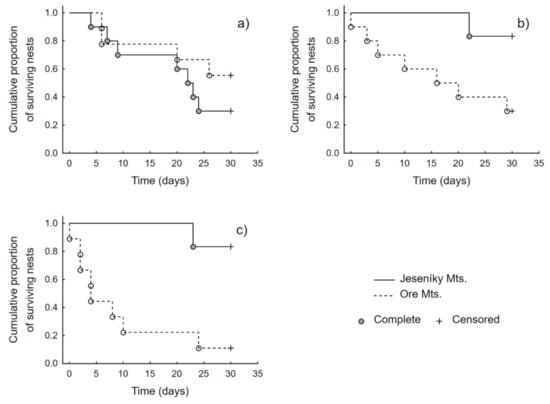 Cumulative proportion of surviving nests within forest edge (a), forest interior (b), and forest clearings (c) separately for Jeseníky and Ore Mts. Kaplan–Meier method was used to fit the survival curves, complete (predated) and censored (non-predated) nests are indicated.