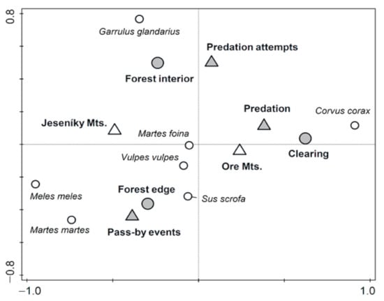 To test the differences in behavior of predator species by the nests within study areas and across habitats, we used multivariate canonical correspondence analysis (CCA) using Canoco 5 software [61]. Data unit was represented by events represented by predation, predation attempts and pass-by events (n = 82). We used presence/absence of each predator (Eurasian jay Garrulus glandarius, common raven, wild boar Sus scrofra, red fox, Eurasian pine marten Martes martes, stone marten Martes foina, and European badger Meles meles) as response variables. Independent variables were represented by study area (Jeseníky and Ore Mts.), habitat (forest edge, forest interior, and clearing), and category of behavior of predator by nest (predation events, predation attempts, and pass-by events).