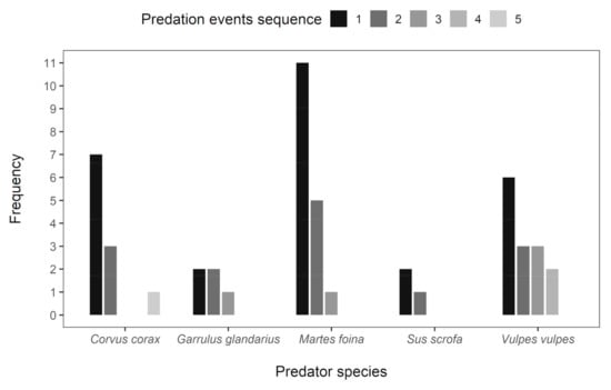 From the analysis of predator occurrence at the nests, we also assessed the sequence of detected predators at each particular nest. Multivariate analysis of the sequence of visiting the artificial nests did not show significant differences among predator species (CCA analysis, 40.2% of explained variability, pseudo-F = 1.6, p = 0.152). Despite this nonsignificant result, we found in the dataset the following patterns. The mammalian predators were the most common predators observed later on at the nests (Figure 4). Stone marten was observed as the first predator at the nest in most cases followed by common raven and red fox. Stone marten was also recorded as a second predator at the nest in most cases. Common raven was as a second predator at the nest recorded with the same frequency as the red fox, but was not recorded as the third or fourth predator, contrary to red fox, which was observed much more frequently during repeated predation. Eurasian jay and wild boar were both observed occasionally during repeated predation (Figure 4). On average, each nest was visited by a predator (predation or scavenging) 1.8 times (95% CI: 1.4–2.2).