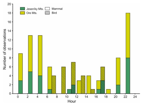 Mammals were mostly recorded during night hours, whereas records of avian predators were restricted to the daytime (Figure 5). We revealed a statistically significant relationship between predator type and time of record (day/night, Table 5). We observed 7 out of 25 records (28%) of mammals during the daytime in Jeseníky Mts. and 23 out of 54 records (43%) in Ore Mts. Independently, we found significant differences between presence of bird and mammalian predators at nests during the course of the day (Table 5, Figure 5).