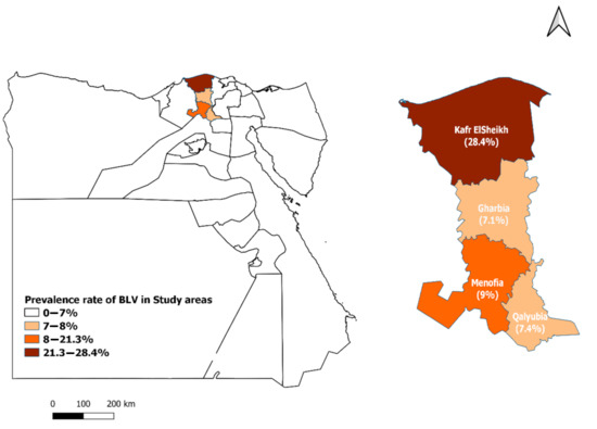 Moreover, the Kafr ElSheikh Governorate is famous for rice agriculture and has many swamp water areas suitable for insect multiplication. Consequently, we believe that the high insect density plays a significant role in the horizontal transmission of BLV infection among cattle in the highly prevalent areas [16,35].