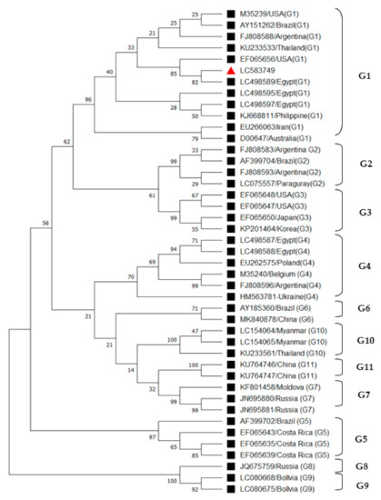 Previous sequence analysis studies based on gp51 region classified the BLV genome into seven distinct genotypes [23]. Subsequently, another phylogenetic study identified genotype 8 among BLV samples in Croatia [24]. Furthermore, analysis of the whole BLV genome revealed the presence of a new genotype (genotype-9) in Bolivia, and another molecular epidemiology study for BLV infection in Thailand confirmed the existence of a further genotype (genotype-10) [25,26]. Recently, the newest BLV genotype (genotype-11) was discovered in China in 2019 [20].