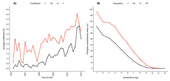 (A) Evolution of the average pedigree-based inbreeding () and relatedness () coefficients from 1984 to 2019; (B) pedigree completeness index in the whole (WP) and reference (RF) populations.
