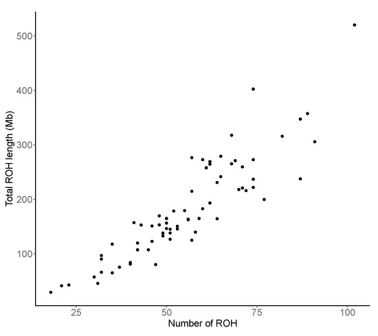 In general, animals with a larger number tend to have a greater total length of segments regardless of the length of single regions (Figure 2). The correlation between the number of identified and the total length was 0.9, meaning that the more regions, the larger is the total length. A Similar result (correlation = 0.78) was recently published by Cesarani et al. [39] in European Simmental bulls.