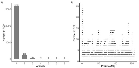 A total of 319 regions were shared (specific ) by at least two animals (Figure 3A). The most shared region was found in nine animals on chromosome 1, located between 0.13 and 2.36 Mb. The similarity among animals in this region was also confirmed by the plot of stacked runs (Figure 3B).