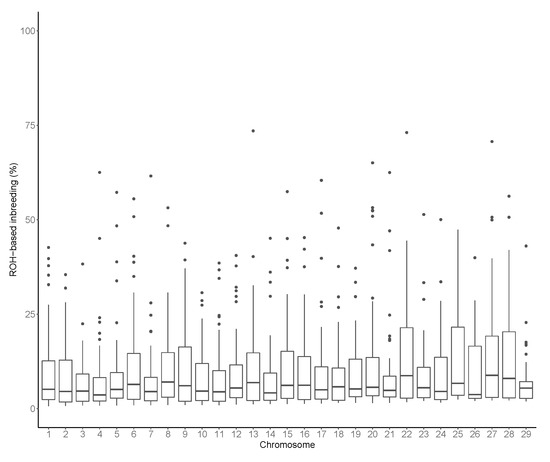 The varied across the autosomes (Figure 4), with the smallest estimates found in BTA3 (6.55%) and the largest value on BTA27 (14.75%). Variation in across chromosomes was also reported in other cattle breeds (e.g., Sumreddee et al. [19]). As stated by Meyermans et al. [48], became the state-of-the-art method for inbreeding assessment during the last decade. Thus, several studies focused on the estimation in several livestock species.