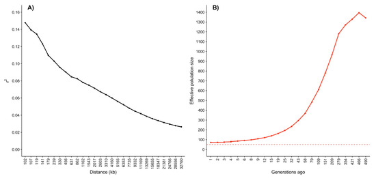 The historical trajectory of effective population size was estimated through linkage disequilibrium () using the SNeP V1.1 software [23]. The was evaluated using the squared Pearson’s product-moment correlation coefficient between pairs of loci ( for unphased data as proposed by Barbato et al. [23] as follows: