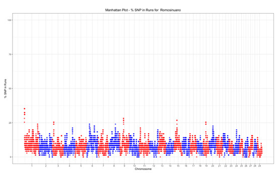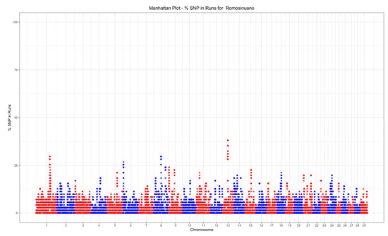 The average total length per animal () was 180.45 ± 92.40 Mb. Compared to found in other studies with cosmopolitan breeds, the found in the present study had an intermediate value. For instance, Szmatoła et al. [46] reported of 290.6 ± 67.2, 142.8 ± 67.4, and 180.5 ± 79.9 Mb for Holstein, Polish Red, and Limousin, respectively. Larger per animal were reported in the literature for Brow Swiss (371 Mb) and Holstein (297 Mb) by Marras et al. [40]. The same authors reported smaller values for the Piedmontese cattle (106 Mb).