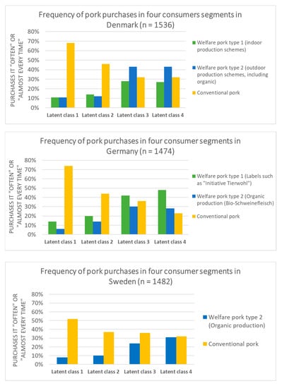 In all three countries, statistically significant differences exist in terms of the frequency with which the different pork types are purchased by the four consumer segments. The differences are also statistically significant after controlling for socio-demographic factors and other important consumer considerations for purchasing pork (see Supplementary File S4 for detailed test results).