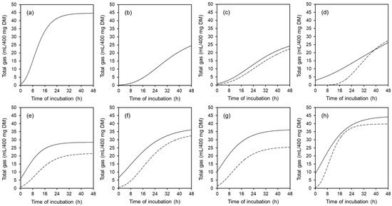 Cumulative gas production of starch (a), purified cellulose (b), powdered cellulose (c), mycelium of Aspergillus niger (d), lucerne chaff (e), soybean shells (f), wheat bran (g), and sugar beet pulp (h), with pre-digestion (dashed line) and without pre-digestion (solid line), modeled by Gompertz non-linear regression function. DM: dry matter.