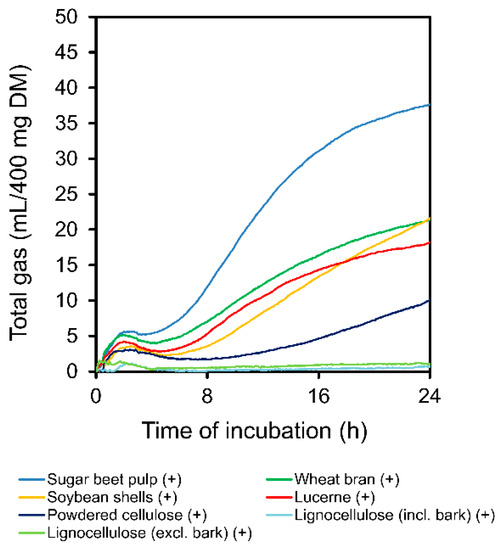 The physicochemical properties of the substrates may significantly affect fermentability. The analyzed WBC, WHC, and SC values were generally within the range reported by previous studies [19,20], although the used analytical methods may have differed in parts. The SC of sugar beet pulp and lignocelluloses was considerably lower than given by Slama et al. [20]. The physicochemical properties of a substrate mainly depend on its (fiber) composition and structure. Large WHC, as found e.g., in powdered cellulose, is associated with feeds that have low bulk density [24]. Such feeds could have gas pockets within their cell wall matrix, which retain water when it is in excess [24]. That way, they are a source of moisture for the growth and metabolic activities of microorganisms [25]. In the digestive tract, they can have a low transit rate, which supports efficient digestion and nutrient absorption [24]. Also, substrates that have a high SC, such the A. niger mycelium, increase the surface area and promote microbial colonization and degradation [26].