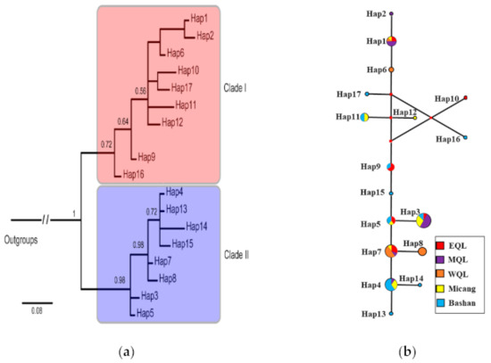 Phylogenetic tree and the median-joining network based on D-loop sequences of wild boar in QM. (a) A Bayesian 50% consensus phylogenetic tree for the 17 sampled haplotypes of Sus scrofa based on D-loop sequences. Numbers above the tree branches are the posterior probabilities. Numbers indicate haplotype codes (abbreviated to save space: e.g., H1 denotes haplotype 1). (b) The median-joining network. Dashes in network represent the corresponding mutation steps. The size of circles denotes the haplotype frequency. Small black circles indicated missing haplotypes that were not observed. The five populations are indicated by different colors. See Table 1 for definitions for EQL, MQL, WQL, Micang and Bashan.
