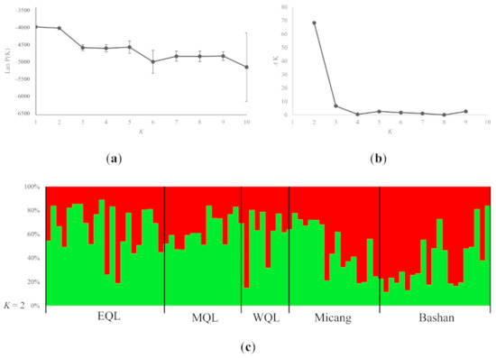 Results of Bayesian model-based clustering in STRUCTURE based on 12 loci. (a) The plot of the mean posterior probability LnP(D); (b) The plot of the values of ΔK against K values (number of clusters) resulting from 10 runs; (c) Bar plots showing Bayesian assignment probabilities for Table 1 for definitions of EQL, MQL, WQL, Micang and Bashan.