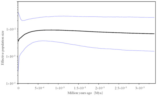 To infer detailed characteristics of demographic history, we used the Bayesian Skyline Plot (BSP) model by using BEAST 1.8.4 [33]. The molecular clock of 3% substitutions per site per million years was used, which was obtained from the evolutionary rates of mtDNA estimated in previous studies [34,35]. We performed runs with a Markov Chain Monte-Carlo (MCMC) chain length of 1 × 108 generations, and trees were sampled every 1000 generations. This analysis was run in the following parameters: GTR + G substitution model without site heterogeneity, relaxed log-normal molecular clock model and tree prior: coalescent Bayesian skyline, with 10 groups and a piecewise-constant skyline model. The first 25% of the generations were discarded as burn-in. All analyses were run to achieve an effective sample size (ESS) at least 200 for all estimated parameters. The effective population size for the posterior distribution of the estimated parameter values was determined using Bayesian skyline plot analysis with the stepwise (constant) model, using TRACER ver. 1.7.1 [36].
