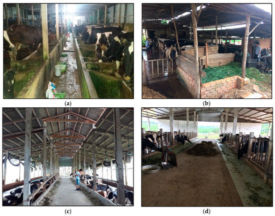 This study was conducted from 24 August to 7 October 2017 on 32 SDFs which were randomly selected from four main dairy regions (8 SDFs per region) of Vietnam including a south lowland region (SL) (10.82° N, 106.63° E), a south highland region (SH) (11.58° N, 108.14° E), a north lowland region (NL) (20.58° N and 105.92° E) and a north highland region (NH) (21.33° N, 103.91° E). These 8 SDFs per region were selected randomly from 40 SDFs per region that had previously been included in a survey of SDF economics conducted in the same year as the current study [31,32]. Each SDF was visited on an afternoon and the following morning. Examples of typical interiors of SDF in each study region are represented in Figure 1.