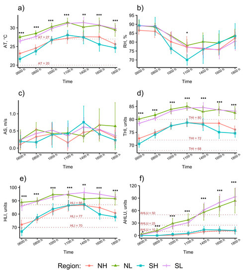 Changes of means of some main microclimate parameters in four regions during day time. (a) Dry-bulb temperature (AT), (b) Relative humidity (RH), (c) Air speed (AS), (d) Temperature-humidity index (THI), (e) Heat load index (HLI), (f) Accumulate heat load units (AHLU). Error bars represent confident intervals; Significant levels: *, p < 0.05; **, p < 0.01; ***, p < 0.001. AT: no thermal stress, AT < 20; heat stress threshold, 20 ≤ AT < 27; mid-severe heat stress, AT ≥ 27 [33,34,35]. THI: normal, THI < 68.0; heat stress threshold, 68 ≤ THI < 72; mild-moderate heat stress, 72 ≤ THI < 80; moderate-severe heat stress, THI ≥ 80 [8]. HLI: cool, HLI < 70; moderate, 70 ≤ HLI < 77; hot, 77 ≤ HLI < 86; very hot, HLI ≥ 86 [6]. AHLU: low, AHLU < 10; moderate, 10 ≤ AHLU < 25; high, 25 ≤ AHLU < 50; very high heat load, AHLU ≥ 50 [6].