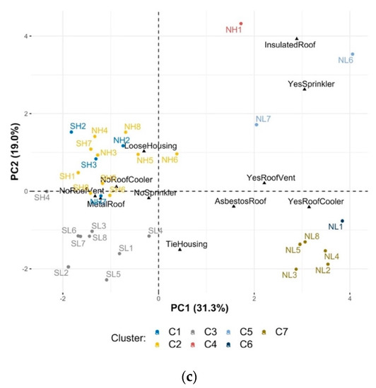 The V-tests results (Table 5) showed the main characteristics of each housing management clusters by comparing the mean of each quantitative variable in each cluster with the mean of that quantitative variable in the whole dataset and comparing the percentage of categories of each qualitative variable in each cluster to the percentage of that category in the whole the dataset. Cluster 1 (two NH SDFs and two SH SDFs) had more mat area per cow, but lower “ridge roof height” than average. Cluster 2 (five SH SDFs and five NH SDFs) all had loose housing, 90% had sheet metal roof and no fans, and they had less mat area per cow but more percentage of sides open compared to average. In Cluster 3 (all eight SL SDFs and one SH SDFs), 87.5% were tie-up housing, all had sheet metal roof type, all had no roof vents and had less floor area per cow than the average. In Cluster 7 (all five were NL SDFs), all had tie-up housing, all had asbestos roof type, all had roof vents, all cooled roofs with soakers and all had higher eave roof height and more fans per cows. Figure 4a,c also show these aspects in the first two PCs.