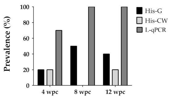 Prevalence of infection of gilthead sea bream experimentally challenged with Enterospora nucleophila by anal intubation (A-1, Trial 4) and sampled at different weeks post-challenge (wpc). Parasite detection in the intestine was carried out from lethal samples by histology with Giemsa (His-G), Calcofluor White (His-CW) staining, and molecular diagnosis (L-qPCR). Fish with Ct values below 38 were considered qPCR-positive.