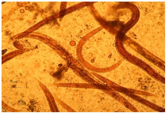 Haemonchus spp. has a direct life cycle. It is transmitted horizontally through grazing on natural pasturelands by third stage (L3) larvae. It has a two-phase life cycle, a free-living and a parasitic within the abomasum of the host. The eggs reach the ground through faeces of the parasitised ruminants, thus infecting herbage. Then, the eggs evolve to first stage larvae (L1), continuing to second stage larvae (L2). The third stage larvae (L3), which is the infective form of this parasite, is the next evolutionary stage. After L3 larvae have been uptaken by a ruminant, they migrate to the predilection site, i.e., the abomasum, where they become adult nematode parasites, expressing their blood-sucking activity [2,7].