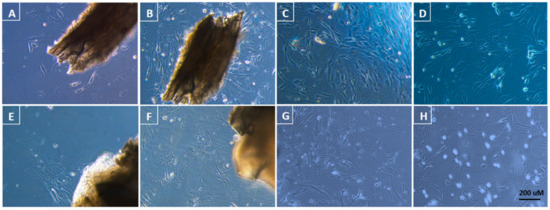 Tissue culture of Triturus cristatus: (A) primary culture of fresh tissue at day 30; (B) day 35; (C) passage 2 cells pre-cryopreservation; (D) passage 2 cells post-warming; (E) primary culture of cryopreserved tissue at day 45; (F) day 65; (G) passage 2 cells pre-cryopreservation; (H) passage 2 cells post-warming. 200 × magnification. Reference bar = 200 uM.