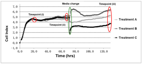 Table 3 displays CI values of the three selected time points for individual 2. The growth patterns when using 10,000 cells reached a higher CI-level compared to both 7500 and 5000 cells at time point (i) (Supplementary material Figure S1). All treatments with 10,000 cells remained at this level until time point (ii), whereas growth patterns for both 7500 and 5000 cells decreased between the first two time points. The reaction to media change was seen as a drastic decrease in most treatments, but especially within treatment (C), where the decrease ranged between 44% and 87%. After the media change, all treatments reestablished their growth patterns until the last time point (iii), where most curves returned to the same CI level as before, except treatment (C), which displayed a noticeable lower CI level.