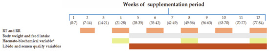 Diagram for the experimental design. RT= rectal temperature; RR= respiration rate; * Haematological variables were carried out at week 12 only.