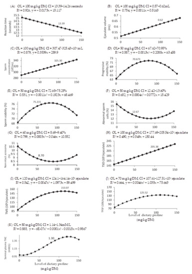 Dose–response curve of reaction time (A), ejaculate volumen (B), sperm concentration (C) and percentages of motile sperm cells (D), viable sperm cells (E), normal sperm cells (F), non-intact acrosome sperm cells (G), total sperm output (TSO, (H)), total motile sperm count (TMSO, (I)), total functional sperm fraction (TFSF, (J)), and seminal plasma antioxidant capacity (TAC, (K)) for different levels of dietary supplemental proline. DM = dry matter, OL = optimum level of dietary supplemental proline, CI = confidence interval, R2 = regression value, and x and y are the dependent variable (proline level) and the independent variable of the regression equation, respectively. The figure only shows significant (p < 0.05) relationships.