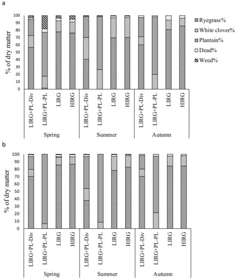 The botanical composition of herbage grazed by dairy cows in lower input ryegrass + plantain-based system (LIRG + PL; 60% of farm area on diverse mix of ryegrass, white clover, and plantain, and 40% of farm area on plantain–white clover mix, 3.5 cow/ha stocking rate, and 150 kg nitrogen/ha/year), lower input ryegrass-based system (LIRG; perennial ryegrass–white clover mix sward, 3.5 cow/ha, and 150 kg nitrogen/ha/year), and higher input ryegrass-based system (HIRG; perennial ryegrass–white clover mix sward, 5 cow/ha, and 300 kg nitrogen/ha/year) collected in spring, summer, and autumn in (a) 2017/18 and (b) 2018/19 milking years.