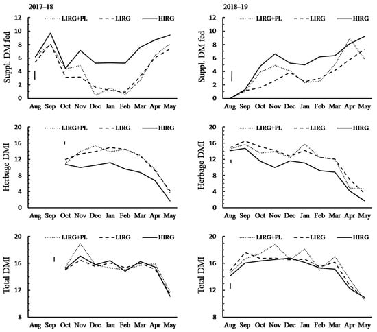Estimated daily dry matter intake (DMI; kg/cow) of herbage (calculated based on individual cow energy output), supplement fed (mixture of maize silage and lucerne silage or grass silage), and total DMI (herbage + supplement; assuming supplement utilisation of 100%) of dairy cows grazing ryegrass and plantain-based swards in a lower input system (3.5 cow/ha stocking rate and 150 kg nitrogen/ha/year; LIRG + PL), perennial ryegrass–white clover mix sward in a lower input system (3.5 cow/ha and 150 kg nitrogen/ha/year; LIRG), or perennial ryegrass–white clover mix sward in a higher input system (5 cow/ha and 300 kg nitrogen/ha/year; HIRG) collected over two milking years, 2017/18 and 2018/19. Bars indicate LSD for farmlet effect within months.