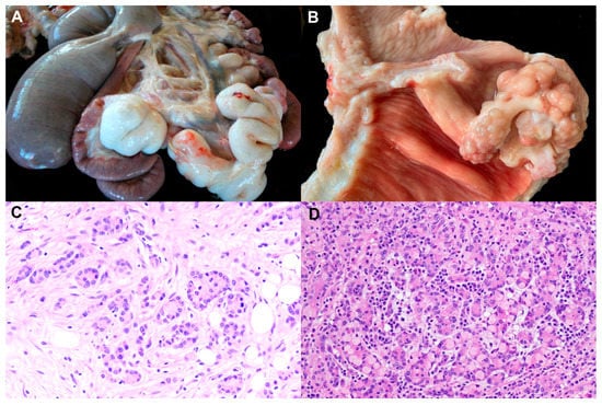 At post-mortem examination, clinically affected sheep showed emaciation together with variable degrees of ascites: from 200 mL to several litres of yellowish fluid [,,]. The edema fluid can be extended to the thoracic cavity []. One streaking feature observed at necropsy was the location of the tumour. The primary site of the tumour was in most cases in the middle third of the small intestine (jejunum), followed by the distal third and more rarely in the duodenum [,,,,]. The tumour was identified by the presence, at those sites, of a dense, firm and white mass extending over serous surfaces of the intestine along the mesentery [,,,,] (Figure 1A).