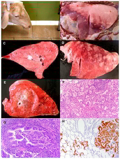 - Ortín, A.; De las Heras, M.; Borobia, M.; Ramo, M.A.; Ortega, M.; Ruíz de Arcaute, M. Ovine pulmonary adenocarcinoma: A transmissible lung cancer of sheep, difficult to control. Small Rumin. Res. 2019, 176, 37–41. [Google Scholar] [CrossRef]