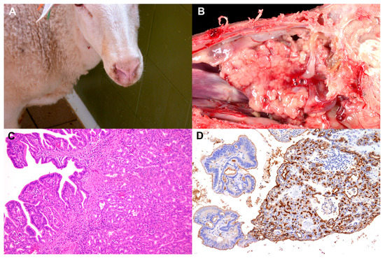 In naturally diseased sheep, the first clinical signs are not clear breathing problems, and a small amount of sero-mucous fluid emerging from the nostrils (unilaterally or bilaterally), dripping continuously from them, is the only detected change. As the disease progresses, more clear respiratory distress is observed with a variable amount of sero-mucous fluid stuck and bubbling around the nostrils when breathing. As respiration becomes more impaired by the tumour growth, snoring, coughing, sneezing, head shaking and mouth-breathing are seen. The increasing and continuous secretion of fluid causes a characteristic depilation on the area close to the upper lips (washed nose) (Figure 3A). As the tumour originates in the ethmoidal area, it expands either cranially inside the nasal cavity or laterally pressing close anatomical structures. As a result of this, close cranial bones are shown to be soft or atrophic, and the overlaid skin may protrude and eventually fistulize. Together with these changes, exophthalmos, as a consequence of the pressure on the retroocular structures, can be seen. In some cases, the tumour penetrates into the frontal sinuses expanding the cranial areas affected, and when tumours are bilateral, the clinical picture is much worse. The animals remain active and with a good appetite, and fever is usually not observed until near the time of death. Body condition is gradually lost, and animals become emaciated and eventually die due to septicaemic or toxaemic complications. The duration of the disease from the appearance of clinical signs to death has been reported to vary from 3 weeks to 9 months [].