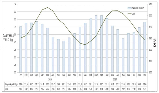 This syndrome was defined on the basis of the official controls carried out by Associazione Italiana Allevatori (the Italian Farmers Association or AIA) on lactating Friesian cattle. These reports consistently show that the average number of Days in Milk (DIM) is low in Friesian cows in the spring period, since a large number of animals have just calved, and milk production is high. On the contrary, in summer, average DIM tends to increase, and production decreases accordingly. Also, this decrease seems to be justified by high temperatures, lower ingestion and less efficient management due to seasonal agricultural commitments in the countryside. Peak calving is observed in late summer to early autumn as a consequence of the summer anestrus [21] in the previous year, which causes plenty of cows to get pregnant in autumn.