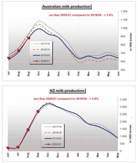 National milk production (tonnes × 103) over four years in Australia and New Zealand (NZ). See: https://ec.europa.eu/—update 10 December 2020. Data source: Dairy Australia and Dairy Companies Association of New Zealand (DCANZ).