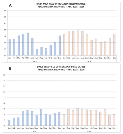 Comparison between average daily milk yield (kg) on a monthly basis of Holstein Friesian (panel (A)) and indigenous Reggiana dairy cattle (panel (B)) in Reggio Emilia Province, Italy. Period: 2015–2016. Courtesy of Alessia Tondo, AIA Studies Office, Italy.