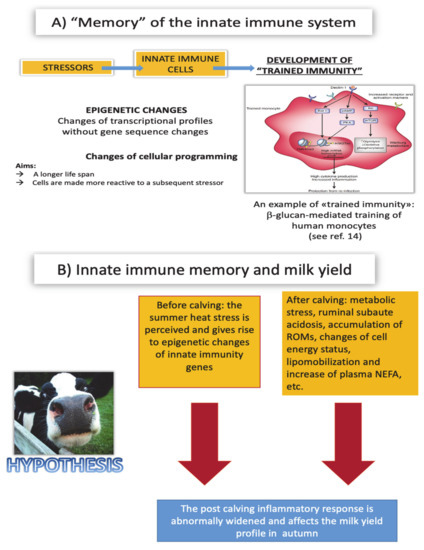 Many studies have shown that the cells of the innate immune system display a “memory”, although different from that of the adaptive immune system. In essence, following stimulation by infectious and non-infectious stressors, the cells of the innate immune system would be able to build a state known as “trained immunity”, meant as outright “education” of the innate immune system: it consists of an epigenetic reprogramming, based on a change in transcriptional activity without permanent genetic changes. These changes in functional programming are prolonged over time and make these cells more reactive to a second stimulation [14]. On the whole, there is strong evidence of major epigenetic regulations of innate immunity genes in ruminants [47,48], which is also viewed in the prospect of a new disease control strategy [49,50,51]. Such epigenetic changes could take place also outside the innate immune system, as previously shown in reproductive biology models [52]. Owing to the above, our hypothesis is that the innate immune system in the dry and transition periods is repeatedly activated by infectious and non-infectious stressors, which is likely to be exacerbated by summer heat stress. The main features of “trained immunity” that could underlie the decrease of milk production in autumn are persistence, damaging effects and the metabolic shift it leads to.