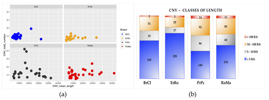 When CNVs are classified according to classes of length (four classes—Figure 1b), all breeds showed different characteristics, even if, as expected, the largest CNVs class is the short one (< 5 Kb) for all breeds (mainly in ErRo).