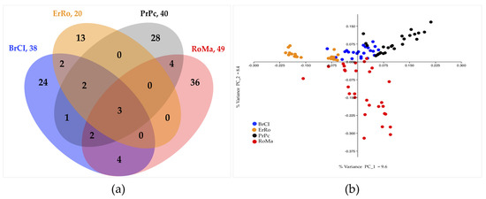 (a) Venn diagram of shared and breed CNVRs (n. 147 in total) of each turkey breed here analyzed; (b) Principal Component Analysis result; PC_1 vs. PC_2 percentage variance values are plotted.