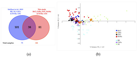 Comparison of seven Italian turkey breeds. (a) Venn Diagram of shared and breed CNVRs of the Italian Turkey breeds here analyzed (BrCI, ErRo, PrPc, and RoMa) and identified by Strillacci et al., 2019 (Brianzolo—BR, Colle Euganei—CoEu, and Nero Italiano—NI); (b) PCA result for the same seven breeds; PC_1 vs. PC_3 percentage variance values are plotted.