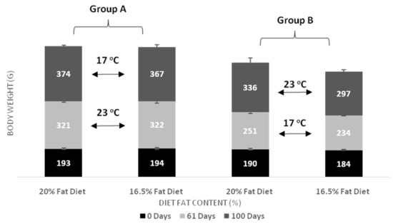 Considering the above, the aim of the present study was to investigate the effect of two dietary lipid levels (16.5% and 20.0%) on growth performance, muscle, and liver composition of European sea bass held under different seawater temperatures, which were designed to simulate a main cycle of changes that occur in Mediterranean autumn, winter, and spring (23→17 °C and 17→23 °C).